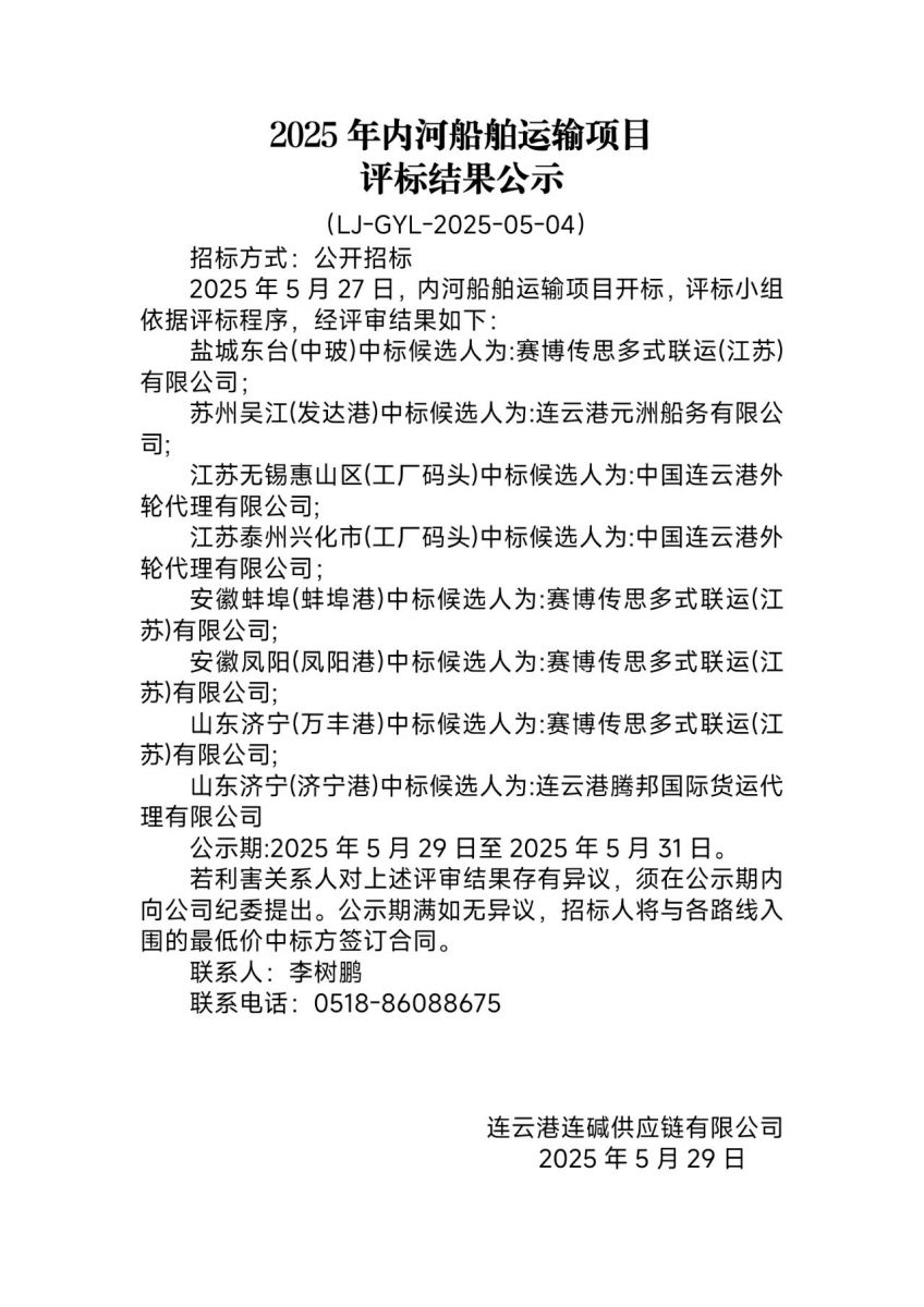 連云港連堿供應鏈有限公司2025年內河船舶運輸項目評標結果公示
