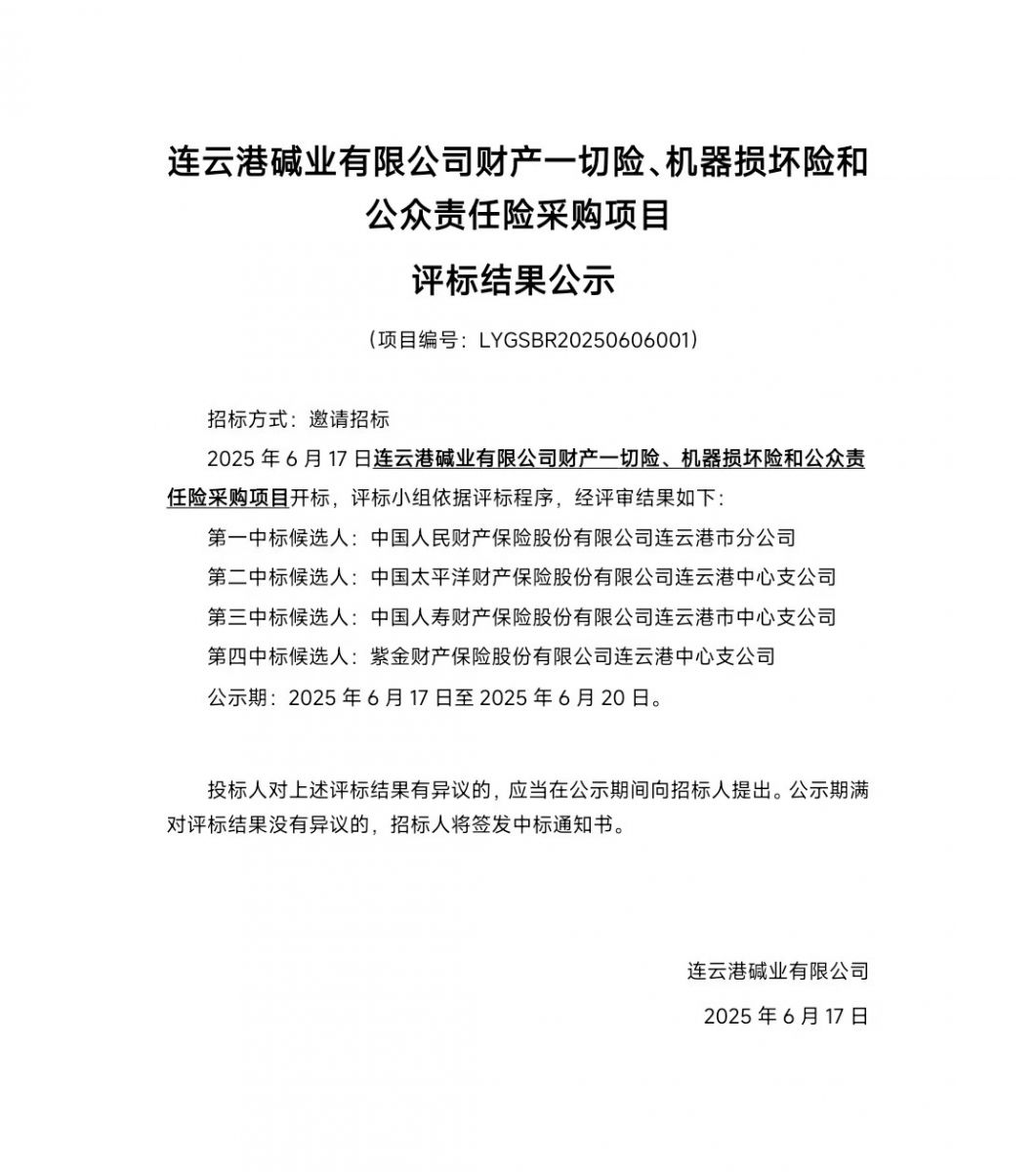 連云港堿業有限公司財產一切險、機器損壞險和公眾責任險采購項目評標結果公示