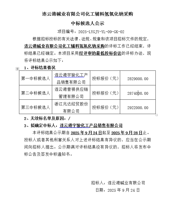 連云港堿業(yè)有限公司化工輔料氫氧化鈉采購(gòu)中標(biāo)候選人公示