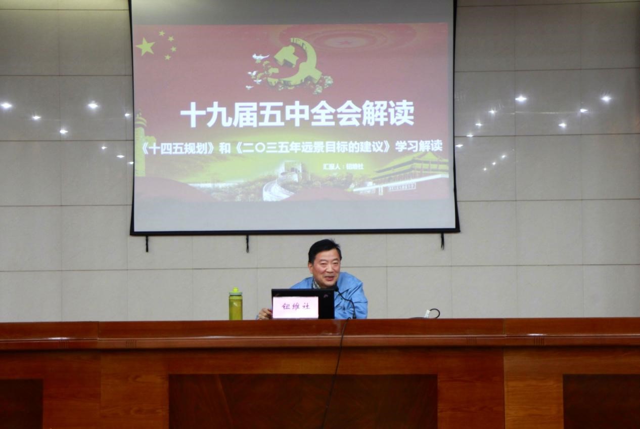 會上,鈕維社從“十九屆五中全會簡介”、“全會召開的背景和意義”、“回眸與展望”、“二0三五年遠景目標”、“十四五規(guī)劃”五個方面,結合具體事例,用通俗易懂的語言進行了全面準確的闡述,對我們認真領會、準確把握十九屆五中全會精神實質具有十分重要的意義。