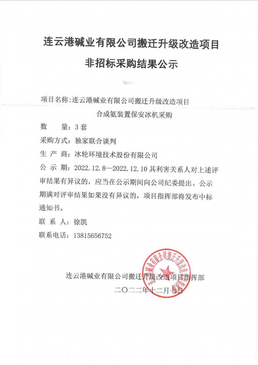 合成氨裝置保安冰機非招標采購結果公示