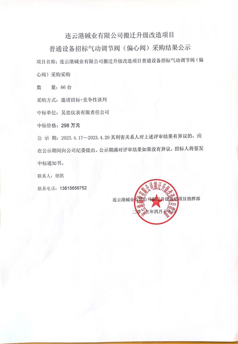 氣動調節閥(偏心閥)采購結果公示