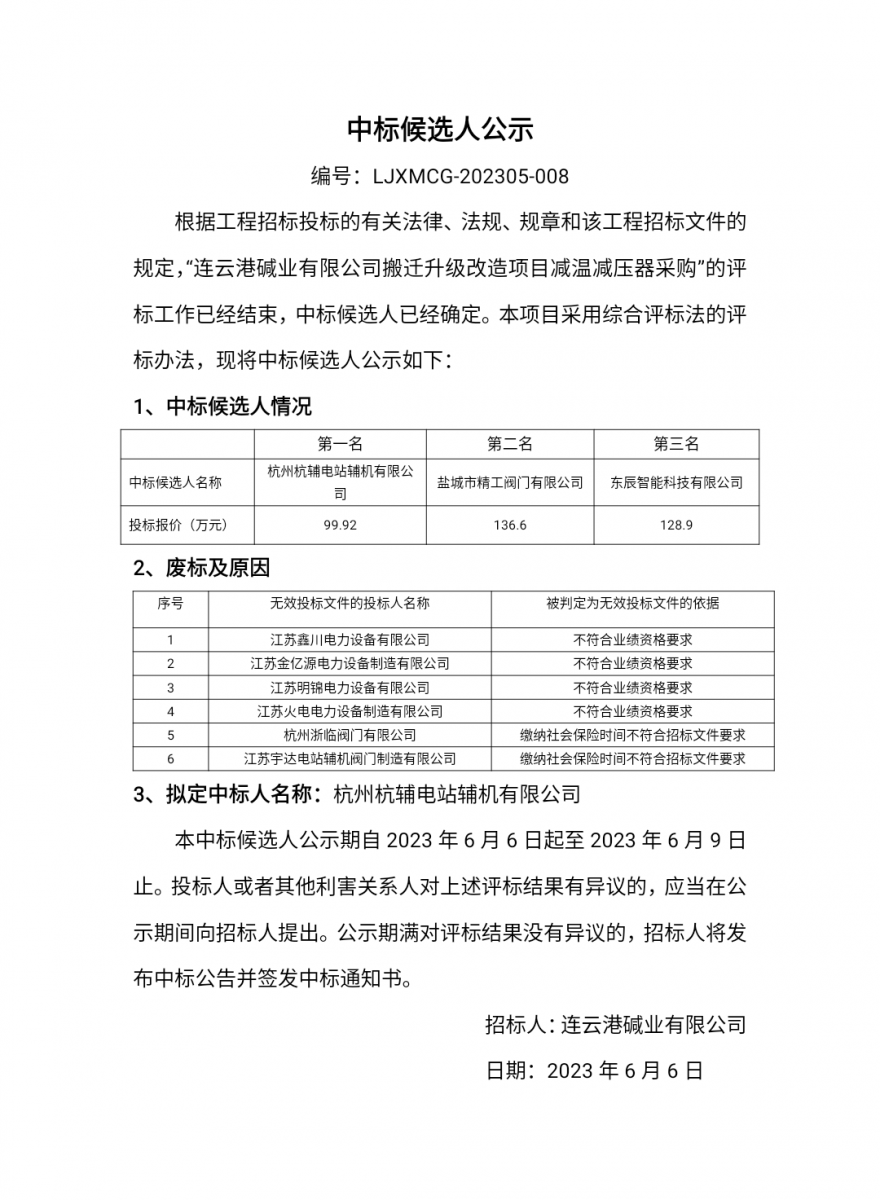 減溫減壓器中標候選人公示
