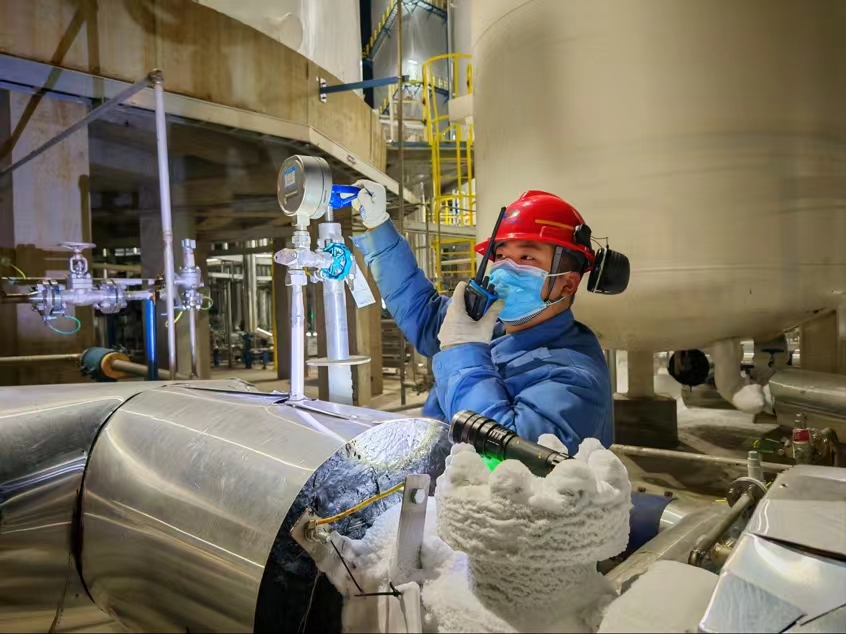 “春節(jié)期間,我們一定堅守崗位,保持最佳狀態(tài),確保各項工作有序推進。” 空分車間員工堅定地說道。“春節(jié)期間更要打起十二分精神,不能有絲毫懈怠。” 他們密切關(guān)注著設(shè)備的運行參數(shù),仔細(xì)記錄著每一個數(shù)據(jù)。“走,除夕夜檢查不能停,一定要確保萬無一失。”夜色中,他們頂著瑟瑟寒風(fēng)認(rèn)真巡檢,檢查空壓機運行狀態(tài),保障儀表氣穩(wěn)定供應(yīng)。為了確保后序工段氮氣吹掃和密封氣供應(yīng),空分車間定時對真空液氮儲槽進行充液,為氮氣供應(yīng)保駕護航。