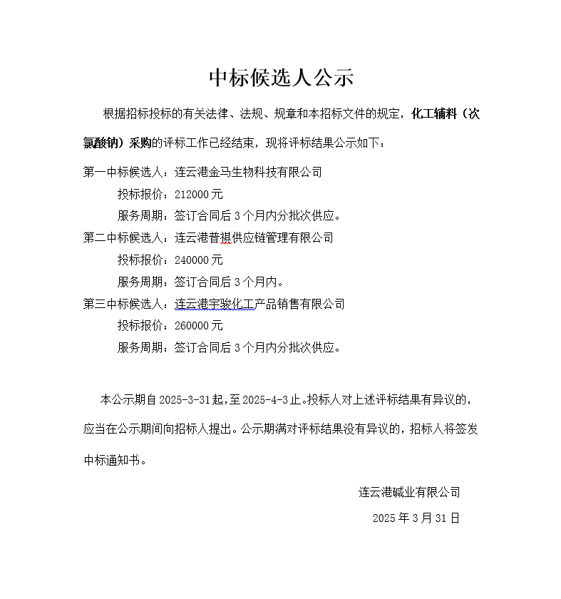 化工輔料次氯酸鈉采購中標候選人公示