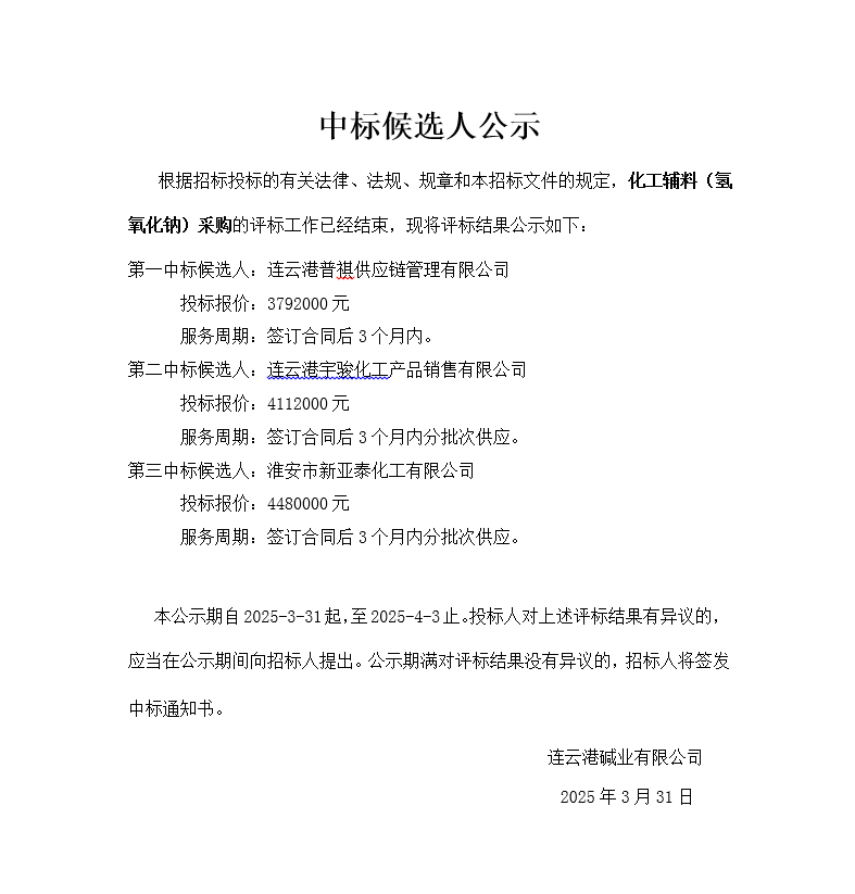 化工輔料氫氧化鈉采購中標(biāo)候選人公示